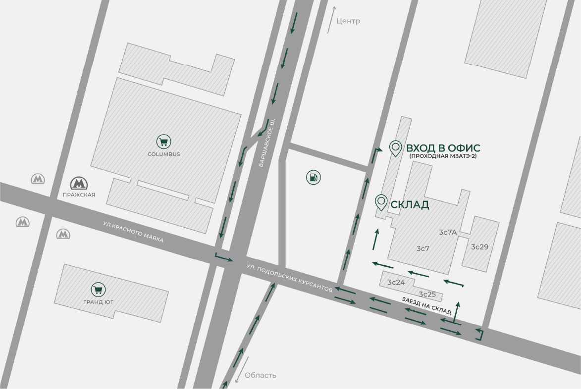 Двигаясь из центра или из области по Варшавскому шоссе, поворачиваем на ул. Подольских курсантов, разворачиваемся на первом светофоре.