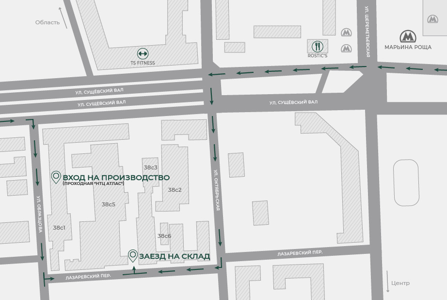 Заезд на склад с Лазаревского переулка, при движении со стороны Октябрьской ул. по правой стороне, при движении со стороны ул. Образцова - по левой стороне переулка. Серые раздвижные ворота в бетонном заборе находятся между зданиями с почтовыми адресами ул. Образцова, д. 38, стр. 4 и ул. Образцова, д. 38, стр. 5.