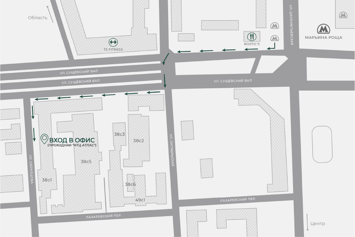 Поворачиваем налево на ул. Образцова. По левой стороне улицы длинное серое трехэтажное здание “НТЦ Атлас”. Вход в проходную под козырьком в центре здания.