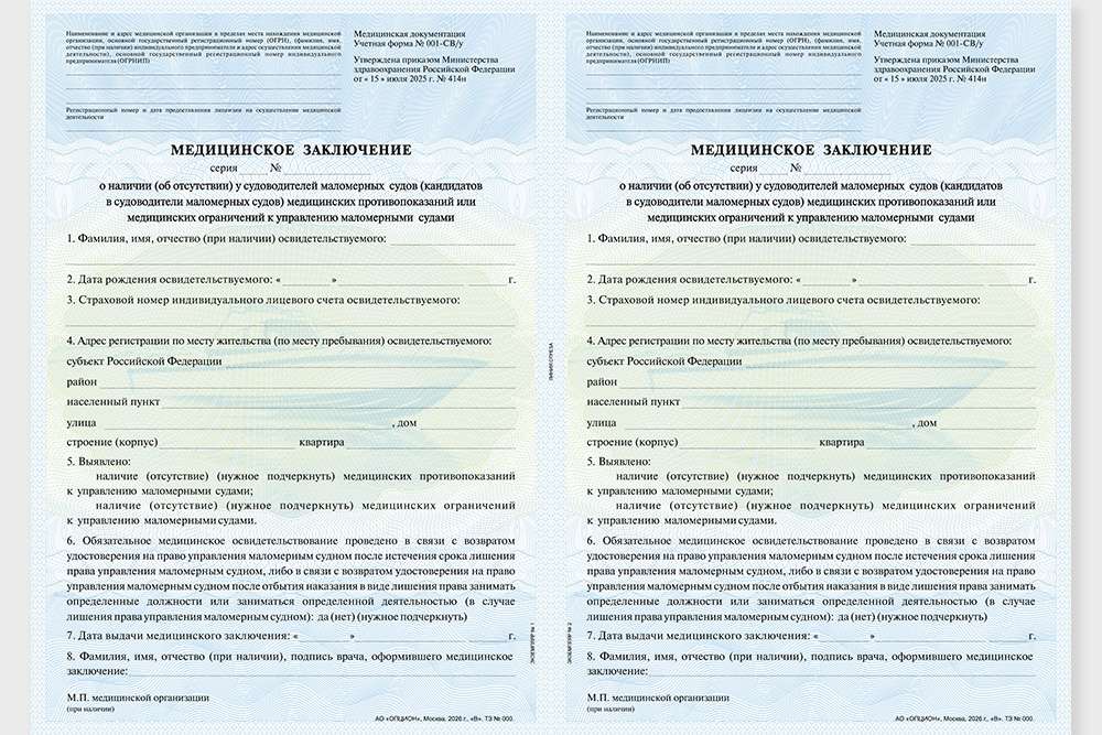 Возможен заказ бланков «Медицинского заключения о наличии (об отсутствии) медицинских противопоказаний или медицинских ограничений к управлению маломерными судами» стандартного дизайна без персонализации.