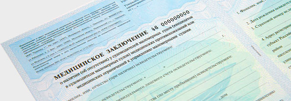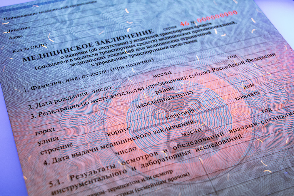 Защитный комплекс бланка медицинского заключения включает бумагу с водяным знаком, микротекст, нумерацию, защитную графику и печать специальными красками. Набор элементов определяется требуемым в приказе Минздрава РФ уровнем защиты документа.